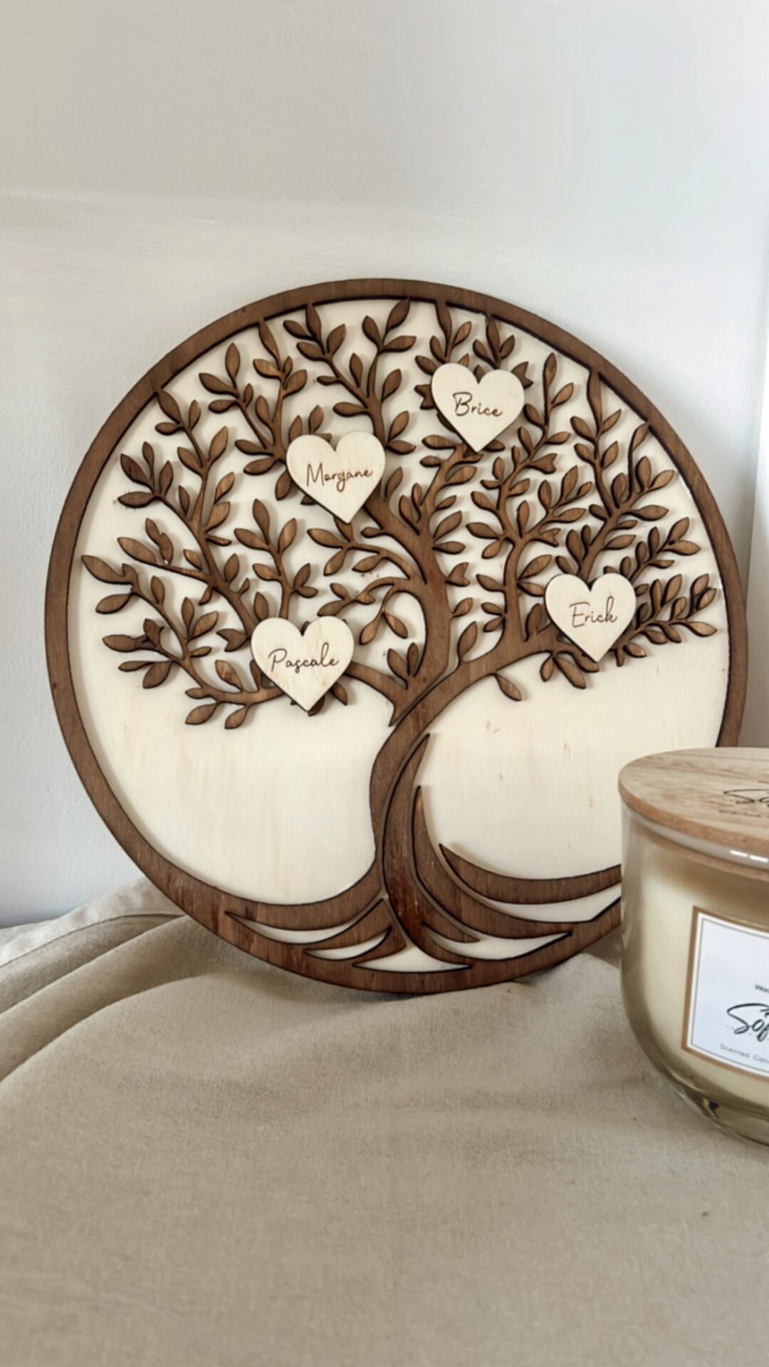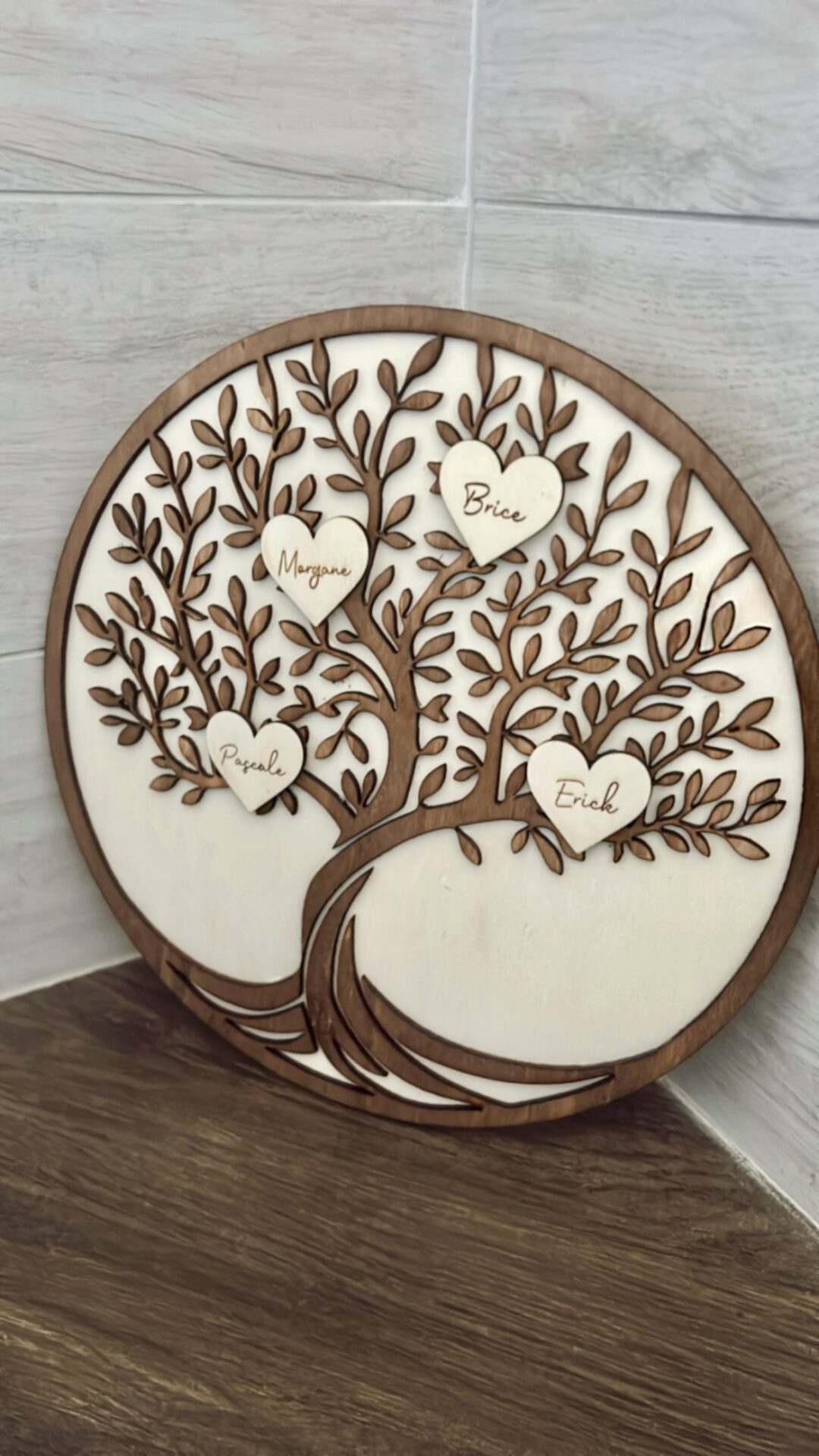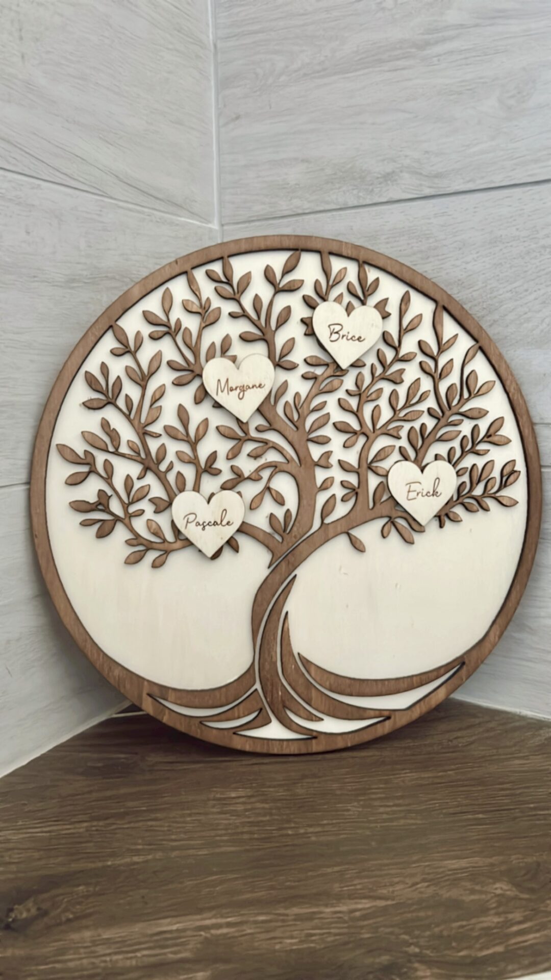 Pour cela je vous propose 3 tailles différentes 20,25 et 30 cm de diamètre. Il est possible de personnaliser les petits coeurs avec les prénoms de vos proches ( plus il y aura de prénoms plus les coeurs seront petits ). Sur demande je peux vous rajouter ou même crée des coeurs vident que vous inscriviez vous même les prénoms et colliez les coeurs où vous souhaitiez sur l’arbre.