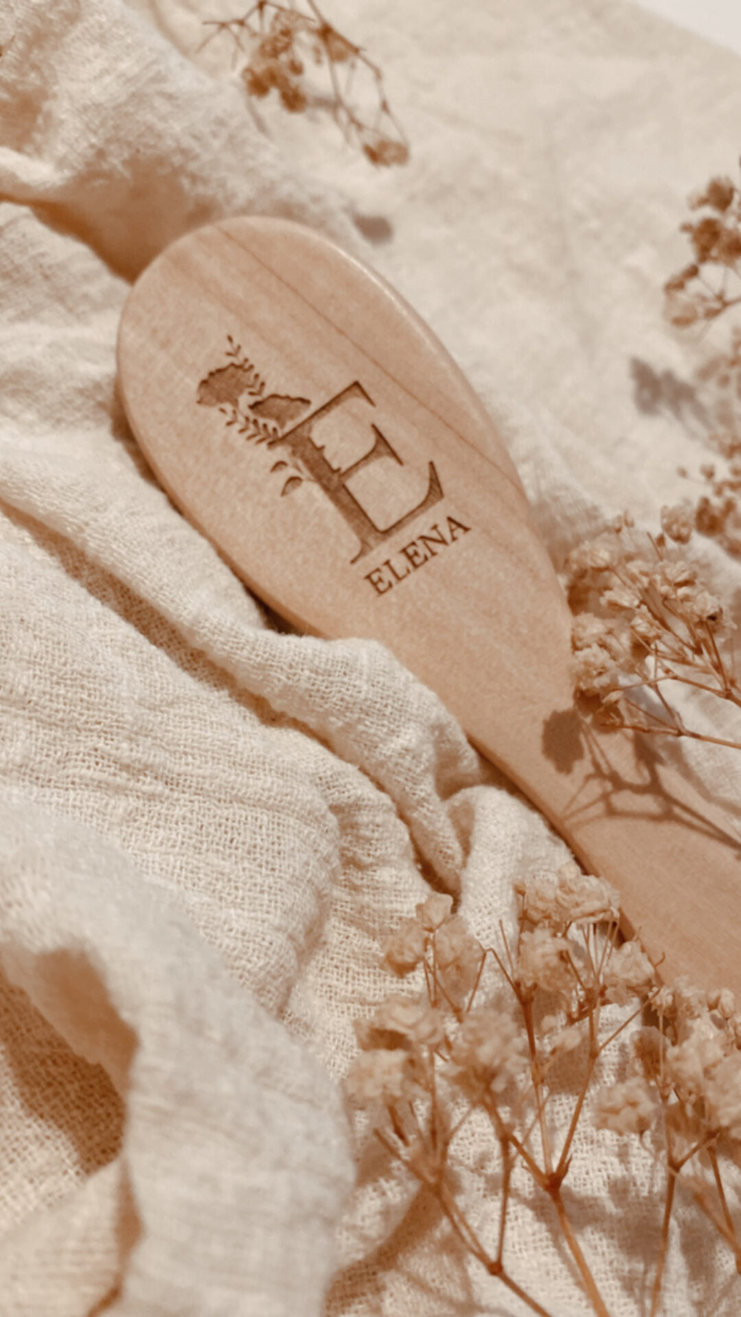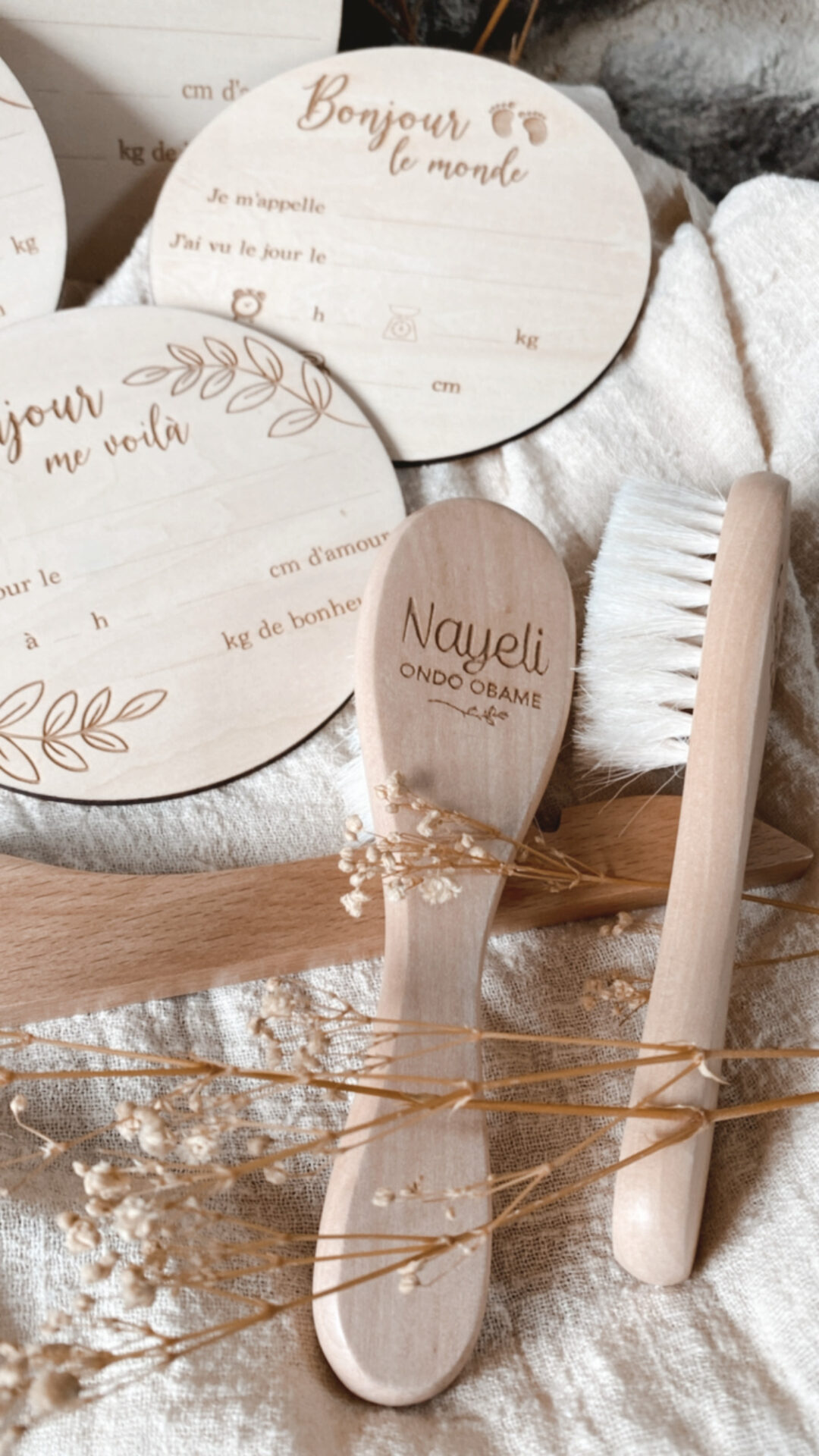Brosse à cheveux bébé personnalisée est en bois avec ses poils idéale pour vos coiffer vos bébés. Un cadeau unique à personnaliser pour une naissance, pour offrir mais également pour s’offrir. La brosse est un cadeau qui peut être ajouté sur votre liste de naissance, ou pour une babyshower.