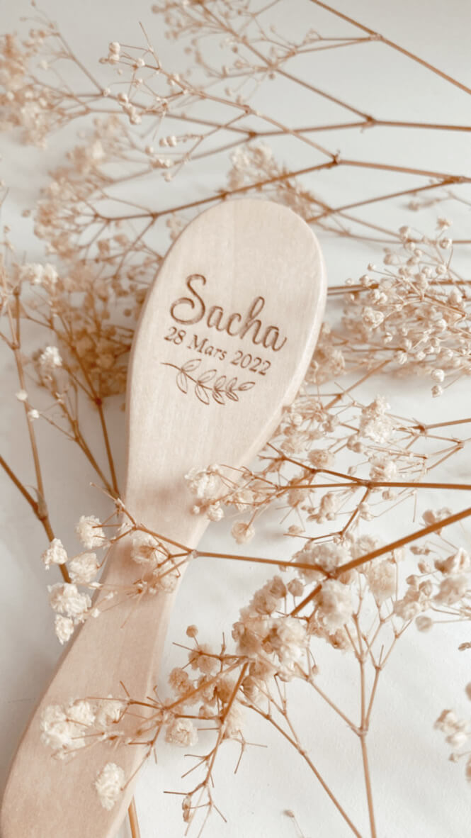 Graver le prénom du bébé, sa date de naissance ou ce que vous souhaitez. Il est possible de graver le prénom, la date de naissance ou les initiales.