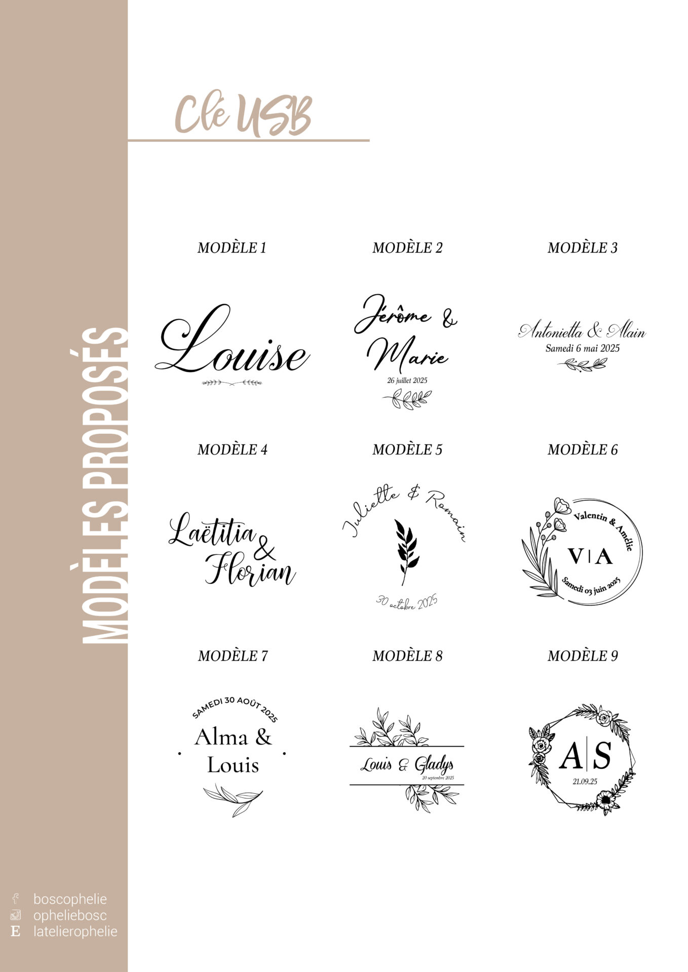 Possibilité de choisir le visuel entre plusieurs modèles. Le texte est entièrement personnalisable. Deux possibilités la clé usb seule ou avec sa boîte de rangement les deux sont personnalisable.