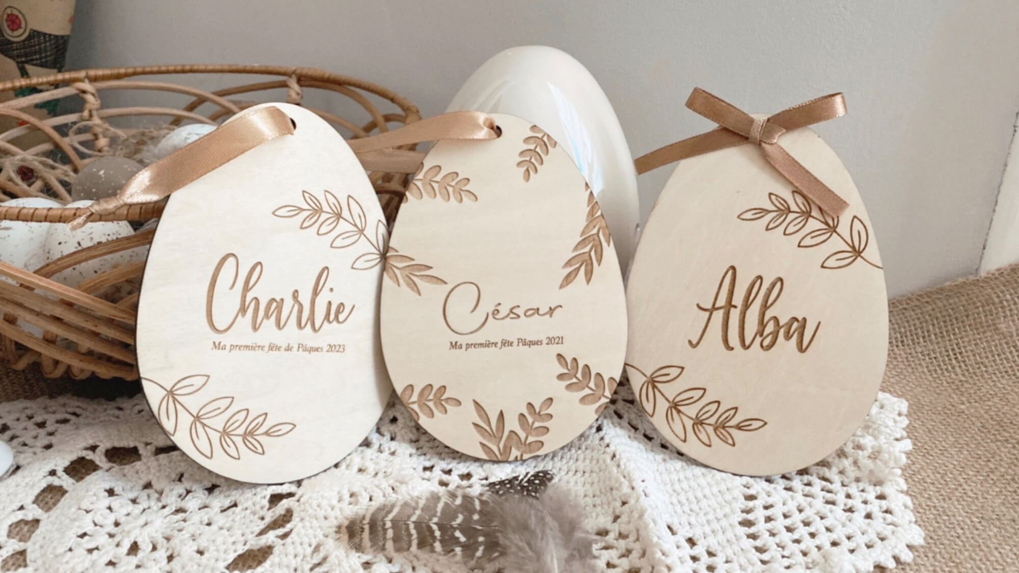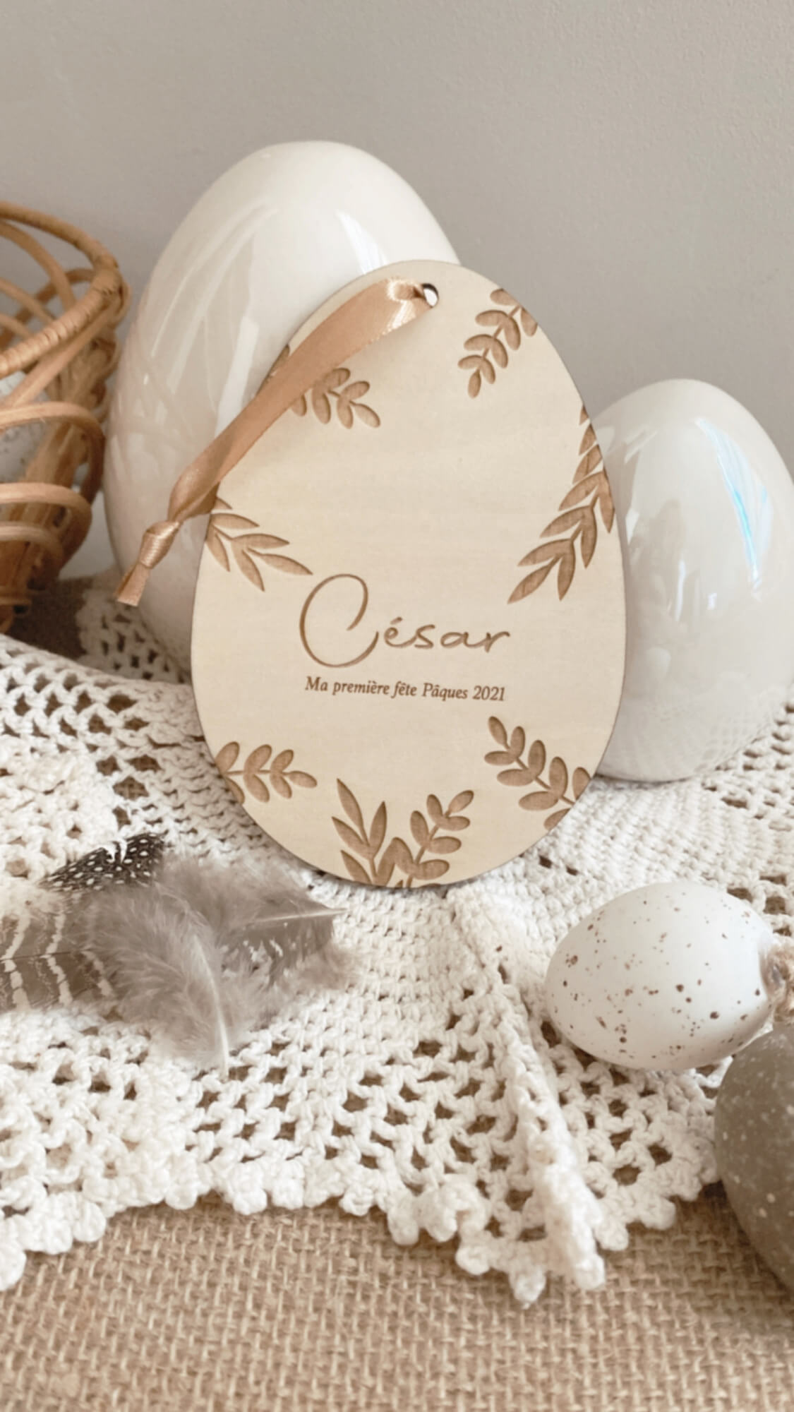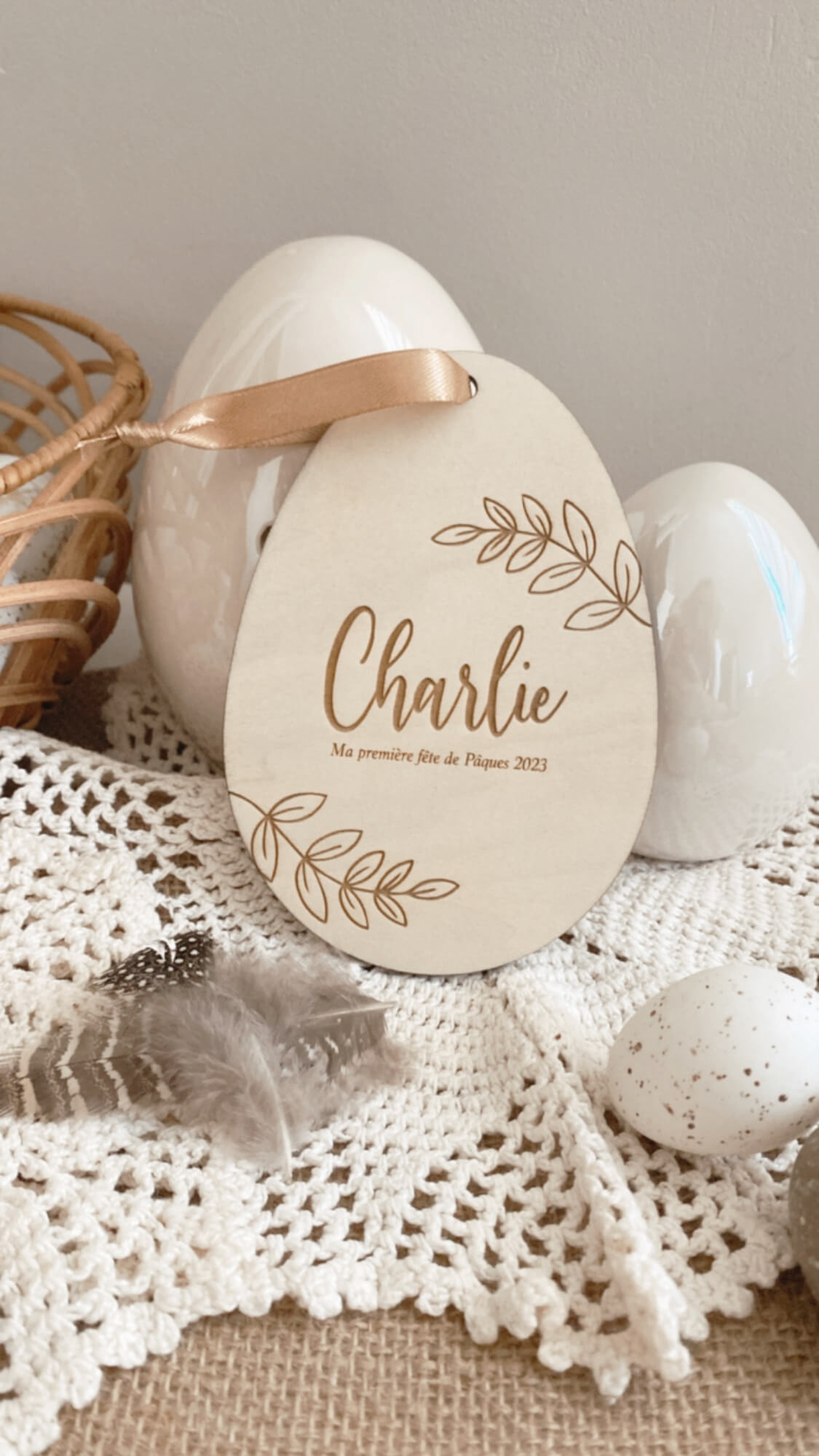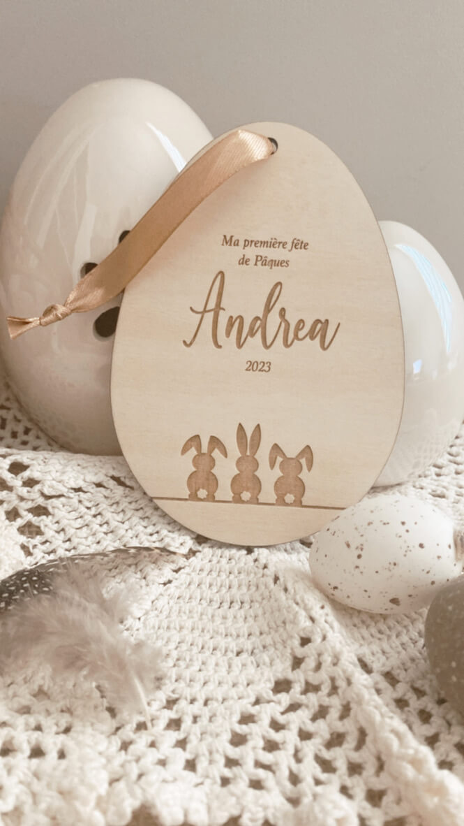 Personnalisez votre décoration pour pâques, petits œufs en bois personnalisés à accrocher aux paniers pour la chasse aux oeufs mais également en déco de table possibilité de l’accrocher grâce au ruban ou bien en décoration avec un joli nœud .