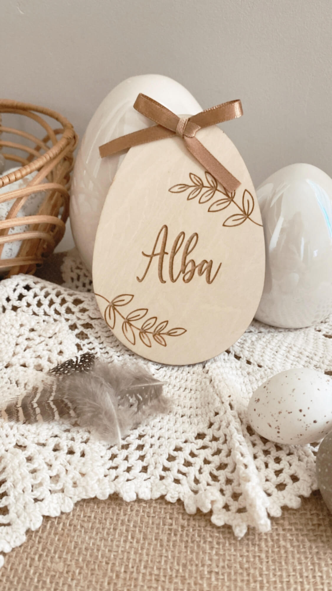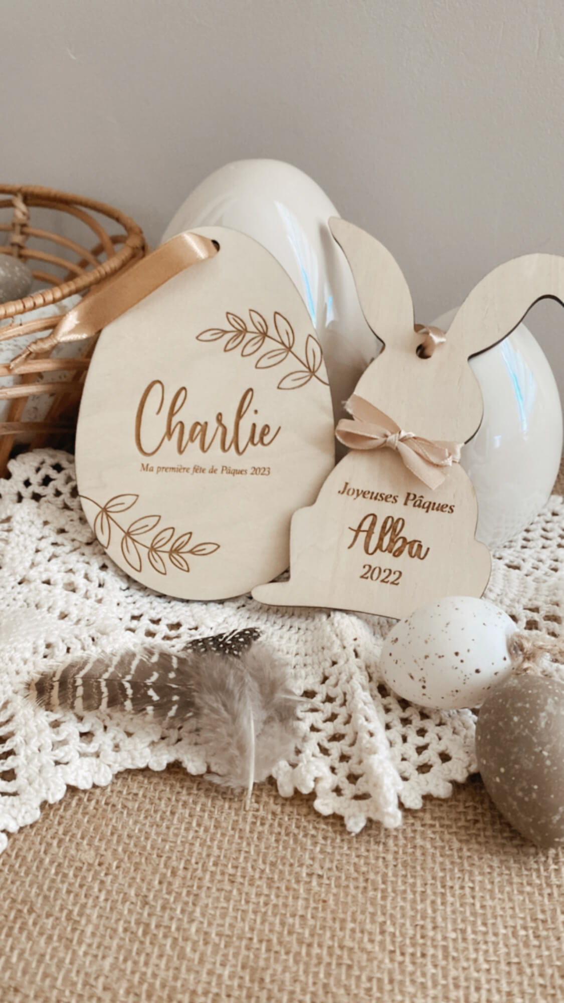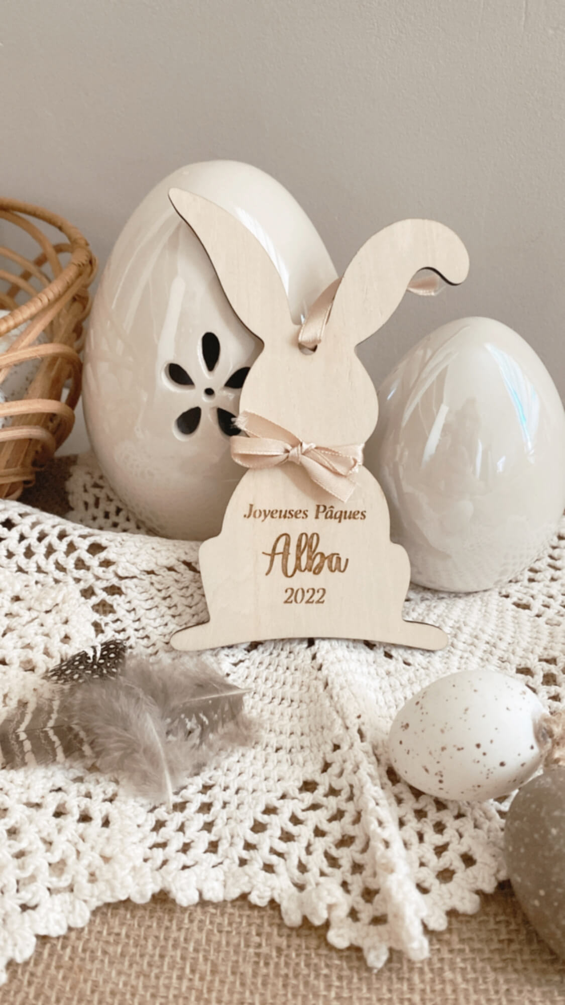 Personnalisez votre décoration pour pâques, petits œufs en bois personnalisés à accrocher aux paniers pour la chasse aux oeufs mais également en déco de table possibilité de l’accrocher grâce au ruban ou bien en décoration avec un joli nœud .